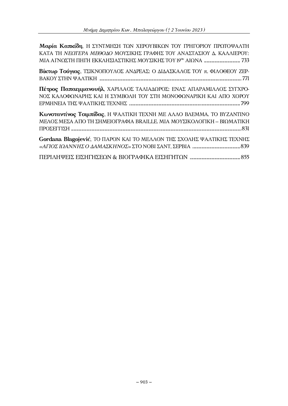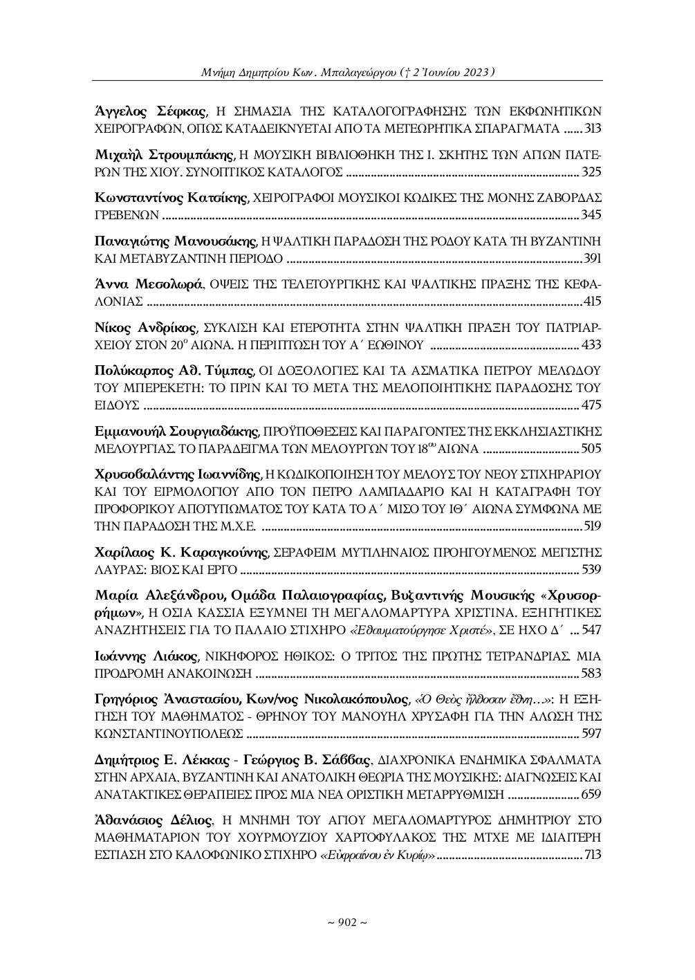 Τα ανά χείρας Πρακτικά του συνεδρίου δημοσιεύονται ως αιώνιο πνευματικό μνημόσυνο του αειμνήστου συναδέλφου μας. Δημοσιεύονται όσες συμβολές κατετέθησαν εγκαίρως στον υποφαινόμενο επιμελητή του παρόντος τόμου, συγκεκριμένα τριάντα πέντε (35) ανακοινώσεις. Στα δημοσιευόμενα κείμενα διατηρήθηκαν οι μεθοδολογικές και φιλολογικές επιλογές των συντακτών τους.Η παρούσα έκδοση εντάσσεται στο εκδοτικό πρόγραμμα του «Εργαστηρίου Βυζαντινής Μουσικολογίας» του Τμήματος Μουσικών Σπουδών της Φιλοσοφικής Σχολής του Εθνικού και Καποδιστριακού Πανεπιστημίου Αθηνών.