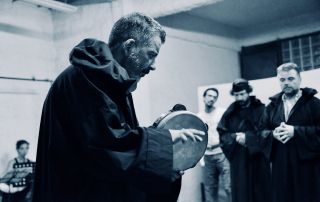 Η παράσταση αξιοποιεί ως βασικό άξονα το κορυφαίο βυζαντινό έργο που επιγράφεται Ακολουθία του ανοσίου τραγογένη σπανού. Πρόκειται για ένα εντελώς ιδιόμορφο κείμενο που εκτιμούσε ιδιαίτερα ο Γιώργος Σεφέρης, μια μοναδική σάτιρα του ύστερου Βυζαντίου σε μορφή εκκλησιαστικής ακολουθίας, που είναι γραμμένη σε δημώδη γλώσσα και παρουσιάζεται για πρώτη φορά στο κοινό. Λογοτεχνικά, η παράδοση του Σπανού φθάνει έως τον Αλέξανδρο Παπαδιαμάντη, ο οποίος είχε συνθέσει μια ομάδα σατιρικών ύμνων. Στην παράσταση το κείμενο του Σπανού λειτουργεί ως αφετηρία που οδηγεί σε ένα ολοκληρωμένο καλλιτεχνικό δημιούργημα με συντελεστές που είναι γνώστες της λειτουργικής πρακτικής στον χώρο της βυζαντινής μουσικής και ανοιχτοί στην έρευνα και τον πειραματισμό προκειμένου να ενσωματώσουν τις παραδοσιακές φόρμες σε μία σύνθεση που αφορά το σημερινό κοινό.