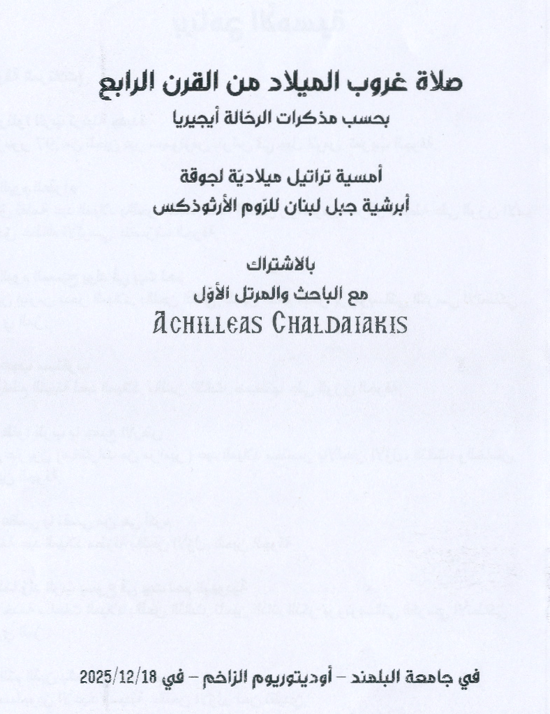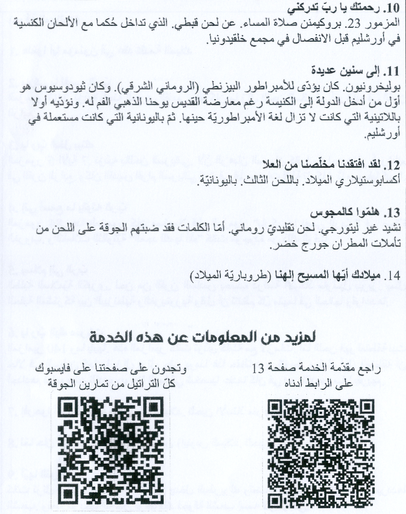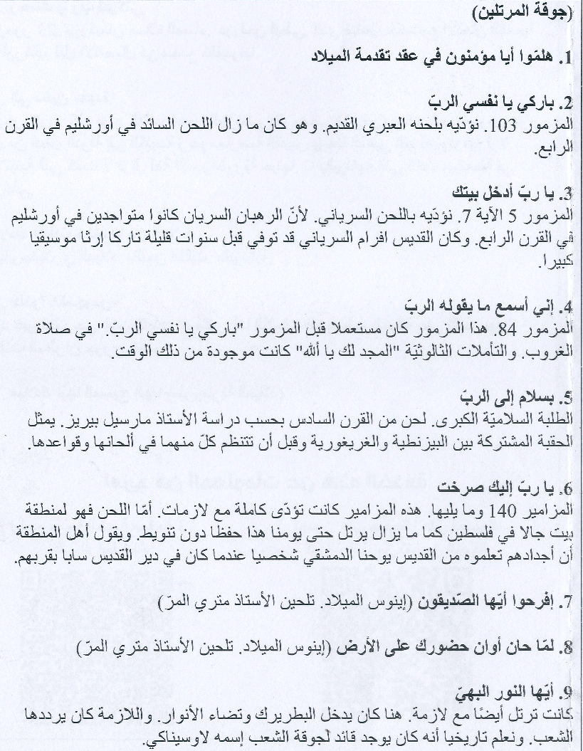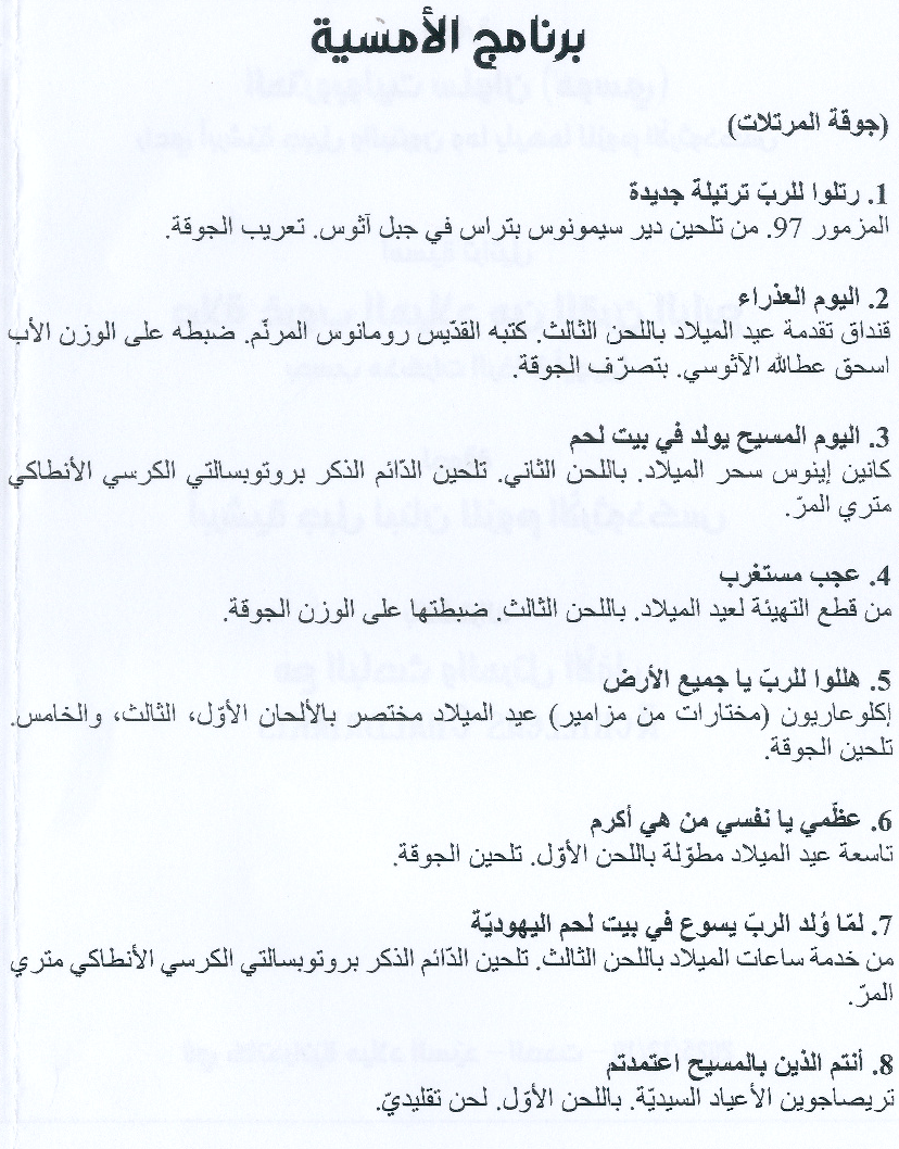 Τα μέρη της ακολουθίας που ερμηνεύει ο υποφαινόμενος, ως προσκεκλημένος μονοφωνάρης, έχουν προσαρμοστεί στην ελληνική γλώσσα, ομοίως από τον συνθέτη Joseph Yazbeck. Η ίδια εκδήλωση, μετά τις δύο συναυλίες στον Λίβανο (Μπάλαμαντ και Βηρυττό), θα παρουσιασθεί επίσης στο Dubai, με επιπλέον προσκεκλημένους μονοφωνάρηδες και από την Ρουμανία, την Σερβία και την Βουλγαρία, προκειμένου να υπογραμμισθεί ο «ποικιλόγλωσσος ήχος» της ορθόδοξης προσευχής.
