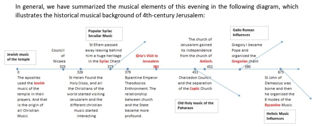 The music for this service is entirely composed by Joseph Yazbeck. Joseph, attempts to incorporate the musical amalgam of 4th-century Jerusalem into his new composition. As he himself notes, in a study on the preparation of this liturgical-musical project, “there was a large wave of pilgrimage from the Christian world to Jerusalem, particularly after Saint Helena discovered the Holy Cross a few decades earlier (in 326 A.D.), which made Jerusalem a global religious center. As a result, all kinds of liturgical musical styles from various regions converged there”. Thus, he uses musical idioms as reflected in the following traditions: Jewish, Syriac, Coptic, Antiochian, Palestinian, Byzantine, and pre-Gregorian (see also the relevant diagram).