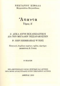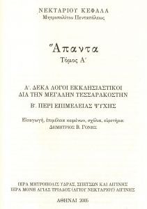 - Νεκταρίου Κεφαλᾶ, μητροπολίτου Πενταπόλεως, Ἅπαντα, τόμος Α’. Α΄. Δέκα λόγοι ἐκκλησιαστικοὶ διὰ τὴν Μεγάλην Τεσσαρακοστήν. Β΄. Περὶ ἐπιμελείας ψυχῆς. Εἰσαγωγή, ἐπιμέλεια κειμένων, σχόλια, εὑρετήρια: Δημήτριος Β. Γόνης, Ἀθῆναι 2005 (καὶ β’ ἔκδοση, Ἀθῆναι 2010).