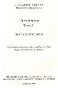 - Νεκταρίου Κεφαλᾶ, μητροπολίτου Πενταπόλεως, Ἅπαντα, τόμος Β’. Ἱερατικὸν Ἐγκόλπιον. Προλεγόμενα, ἐπιμέλεια κειμένων, σχόλια, εὑρετήρια: ἀρχιμ. Χρυσοστόμου Σαββάτου, Ἀθῆναι 2006.