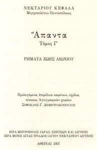 - Νεκταρίου Κεφαλᾶ, μητροπολίτου Πενταπόλεως, Ἅπαντα, τόμος Γ’. Ρήματα ζωῆς αἰωνίου. Προλεγόμενα, ἐπιμέλεια κειμένων, σχόλια, πίνακας ἁγιογραφικῶν χωρίων: Σοφοκλῆς Γ. Δημητρακόπουλος, Ἀθῆναι 2007.
