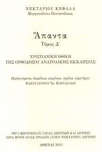 - Νεκταρίου Κεφαλᾶ, μητροπολίτου Πενταπόλεως, Ἅπαντα, τόμος Δ’. Χριστιανικὴ Ἠθικὴ τῆς Ὀρθοδόξου Ἀνατολικῆς Ἐκκλησίας. Προλεγόμενα, ἐπιμέλεια κειμένων, σχόλια, εὑρετήρια: Κωνσταντίνου Ἰω. Κορναράκη, Ἀθῆναι 2010.