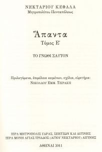 [2] Γιὰ τὴ συγκεκριμένη προσπάθεια παράβαλε καὶ τὸ ἄρθρο τοῦ σεβασμιωτάτου μητροπολίτου πρώην Ὕδρας Ἱεροθέου, ” Ἡ ἔκδοση τῶν Ἁπάντων τοῦ Ἁγίου Νεκταρίου”, Τόλμη. Μηνιαῖο ἐνημερωτικὸ περιοδικὸ τῆς Ἱερᾶς Ἀρχιεπισκοπῆς Ἀθηνῶν, τεῦχος 32, Ἰούλιος-Αὔγουστος 2003, σσ. 64-67.