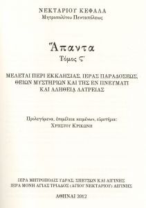 - Νεκταρίου Κεφαλᾶ, μητροπολίτου Πενταπόλεως, Ἅπαντα, τόμος Ϛ’. Μελέται περὶ Ἐκκλησίας, Ἱερᾶς Παραδόσεως, Θείων Μυστηρίων καὶ τῆς ἐν πνεύματι καὶ ἀληθείᾳ λατρείας. Προλεγόμενα, ἐπιμέλεια κειμένων, εὑρετήρια: Χρήστου Κρικώνη, Ἀθῆναι 2012.
