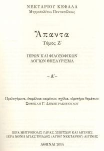 - Νεκταρίου Κεφαλᾶ, μητροπολίτου Πενταπόλεως, Ἅπαντα, τόμος Ζ’. Ἱερῶν καὶ Φιλοσοφικῶν Λογίων Θησαύρισμα-Α’. Προλεγόμενα, ἐπιμέλεια κειμένων, σχόλια, εὑρετήριο θεμάτων: Σοφοκλῆ Γ. Δημητρακόπουλου, Ἀθῆναι 2014.