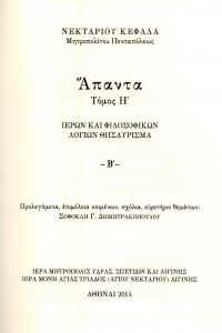 - Νεκταρίου Κεφαλᾶ, μητροπολίτου Πενταπόλεως, Ἅπαντα, τόμος Η’. Ἱερῶν καὶ Φιλοσοφικῶν Λογίων Θησαύρισμα-Β’. Προλεγόμενα, ἐπιμέλεια κειμένων, σχόλια, εὑρετήριο θεμάτων: Σοφοκλῆ Γ. Δημητρακόπουλου, Ἀθῆναι 2014.