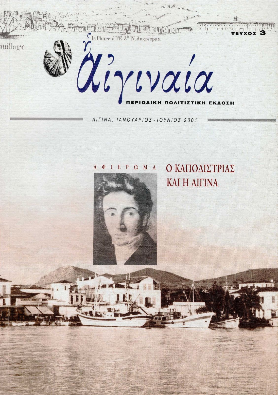 Ἡ Αἰγιναία. Περιοδικὴ πολιτιστικὴ ἔκδοση, τεῦχος 3, Αἴγινα, Ἰανουάριος-Ἰούνιος 2001, [Ἀφιέρωμα: Ὁ Καποδίστριας καὶ ἡ Αἴγινα], σσ. 184