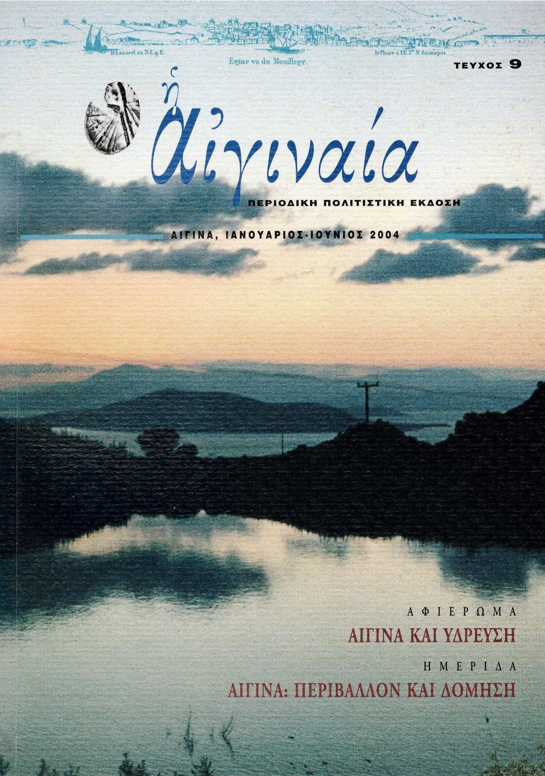 Ἡ Αἰγιναία. Περιοδικὴ πολιτιστικὴ ἔκδοση, τεῦχος 9, Αἴγινα, Ἰανουάριος-Ἰούνιος 2004, [Ἀφιερώματα: Αἴγινα καὶ Ὕδρευση. Ἡμερίδα Αἴγινα: Περιβάλλον καὶ Δόμηση], σσ. 160